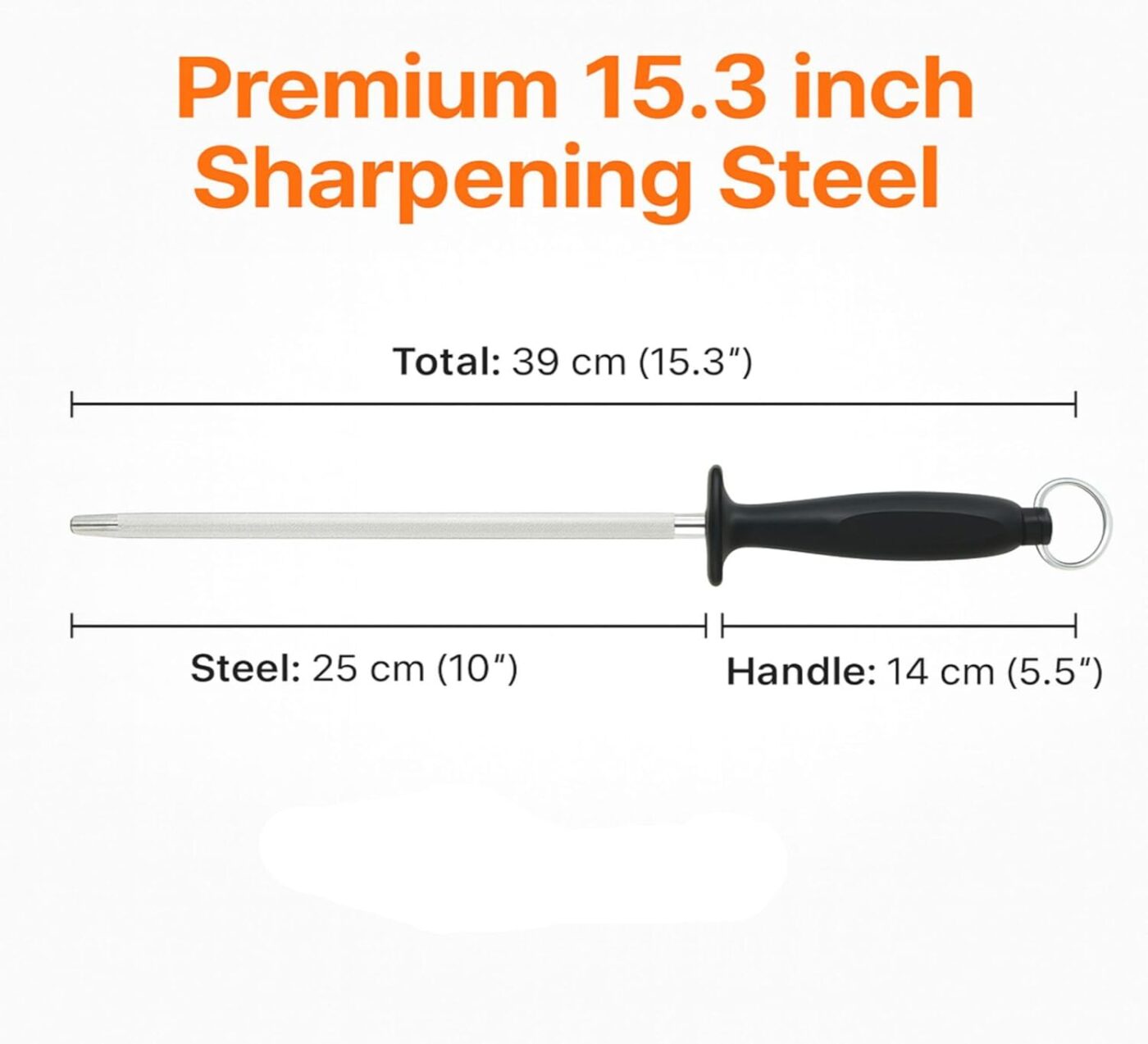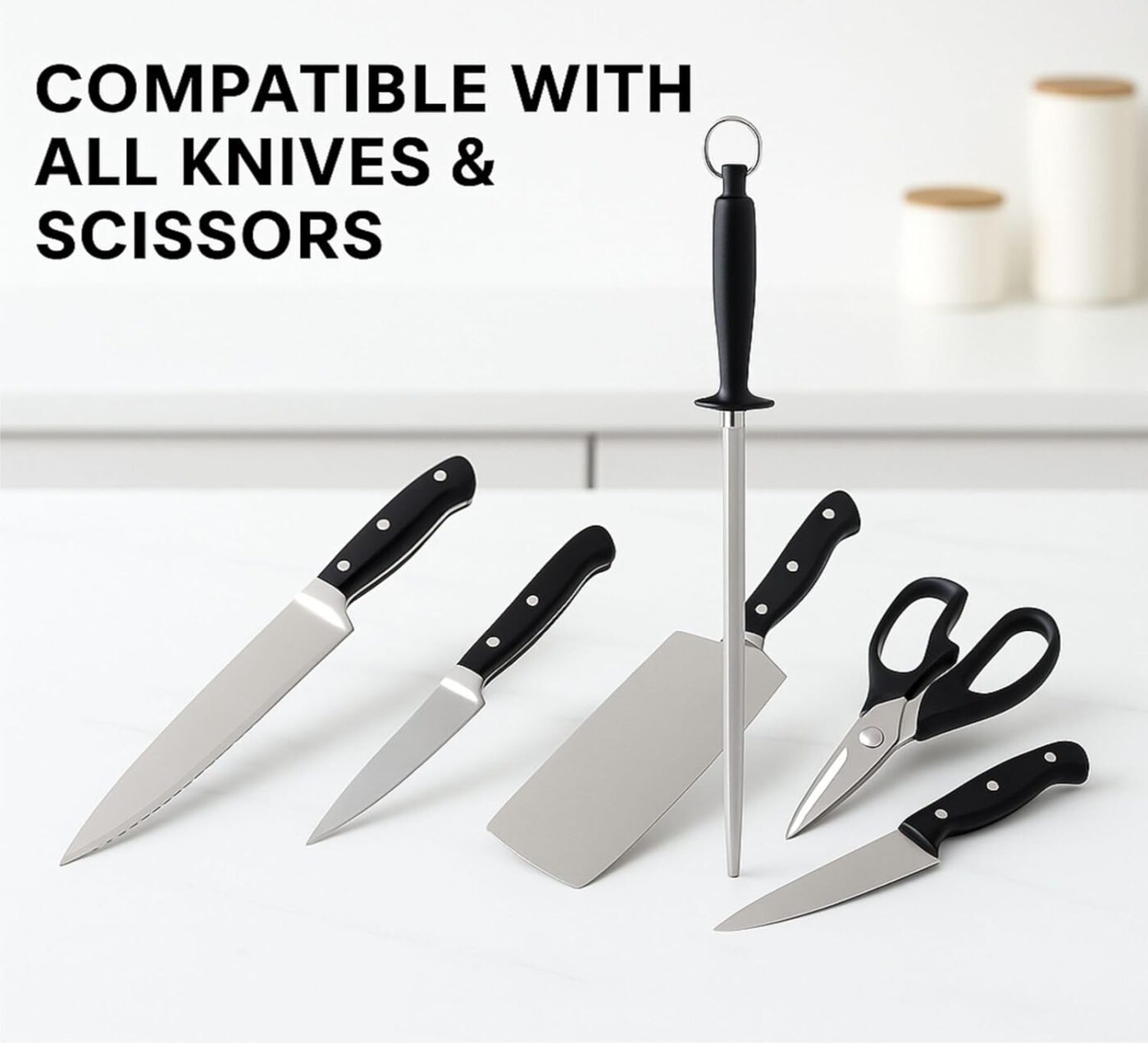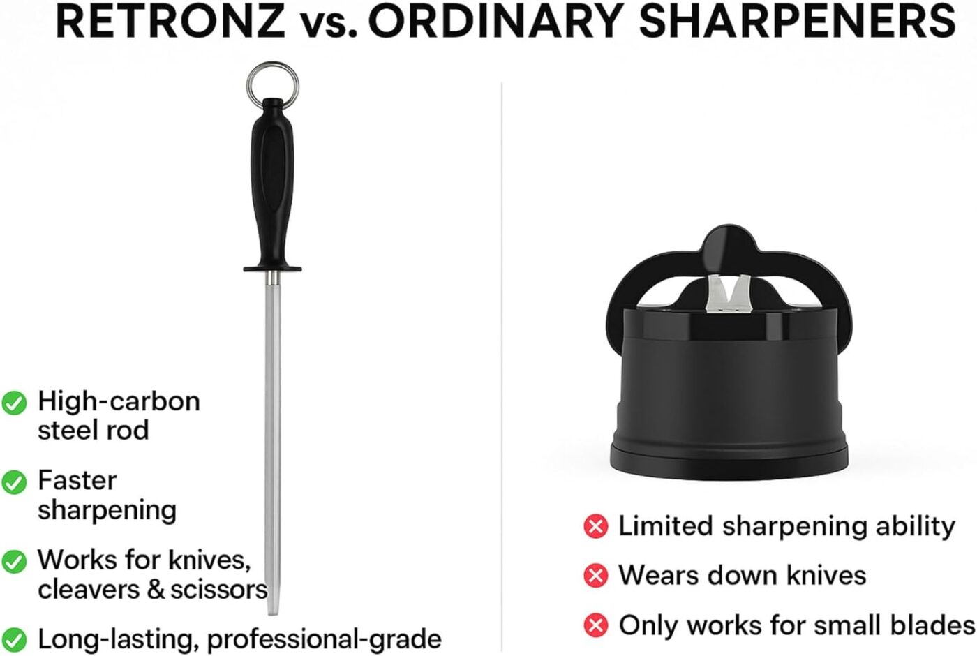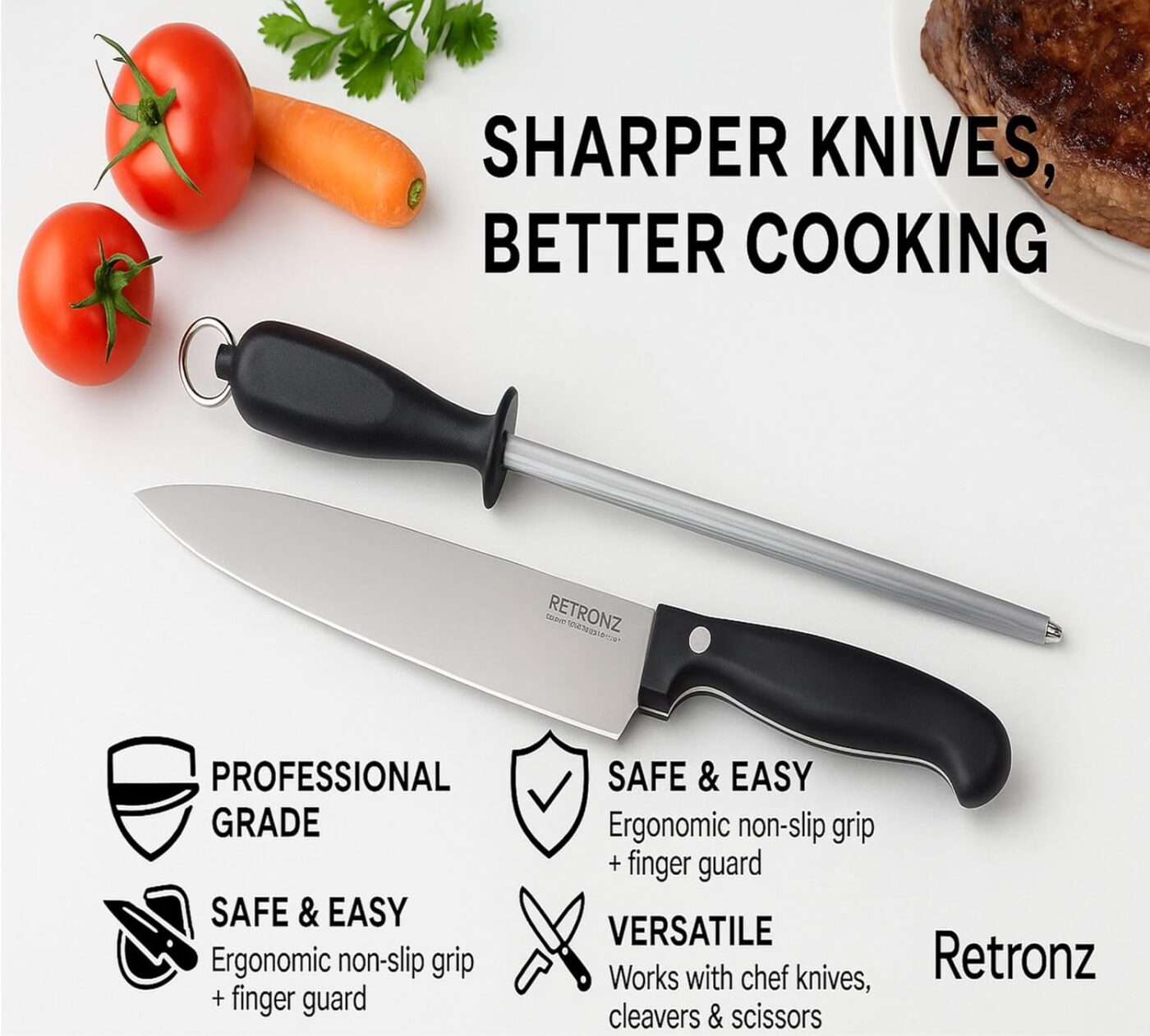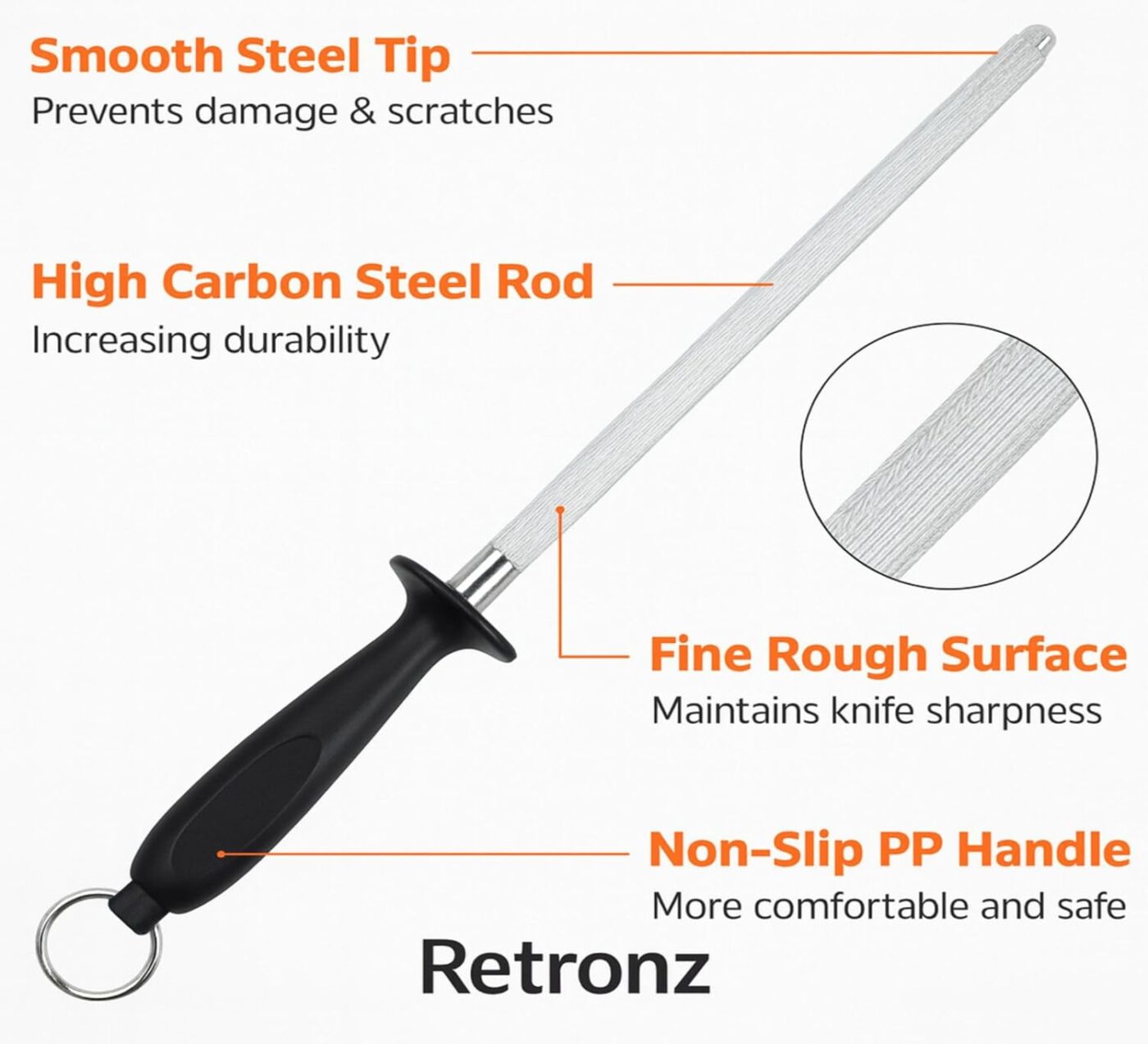 Keep your knives performing like new with the Retronz 10-Inch Sharpening Steel Knife Sharpener, a professional-grade 10 inch knife sharpener built for precision, strength, and safety. Whether you’re a chef, butcher, or home cook, this high-quality honing rod ensures your knives stay sharp, balanced, and ready for effortless cutting.