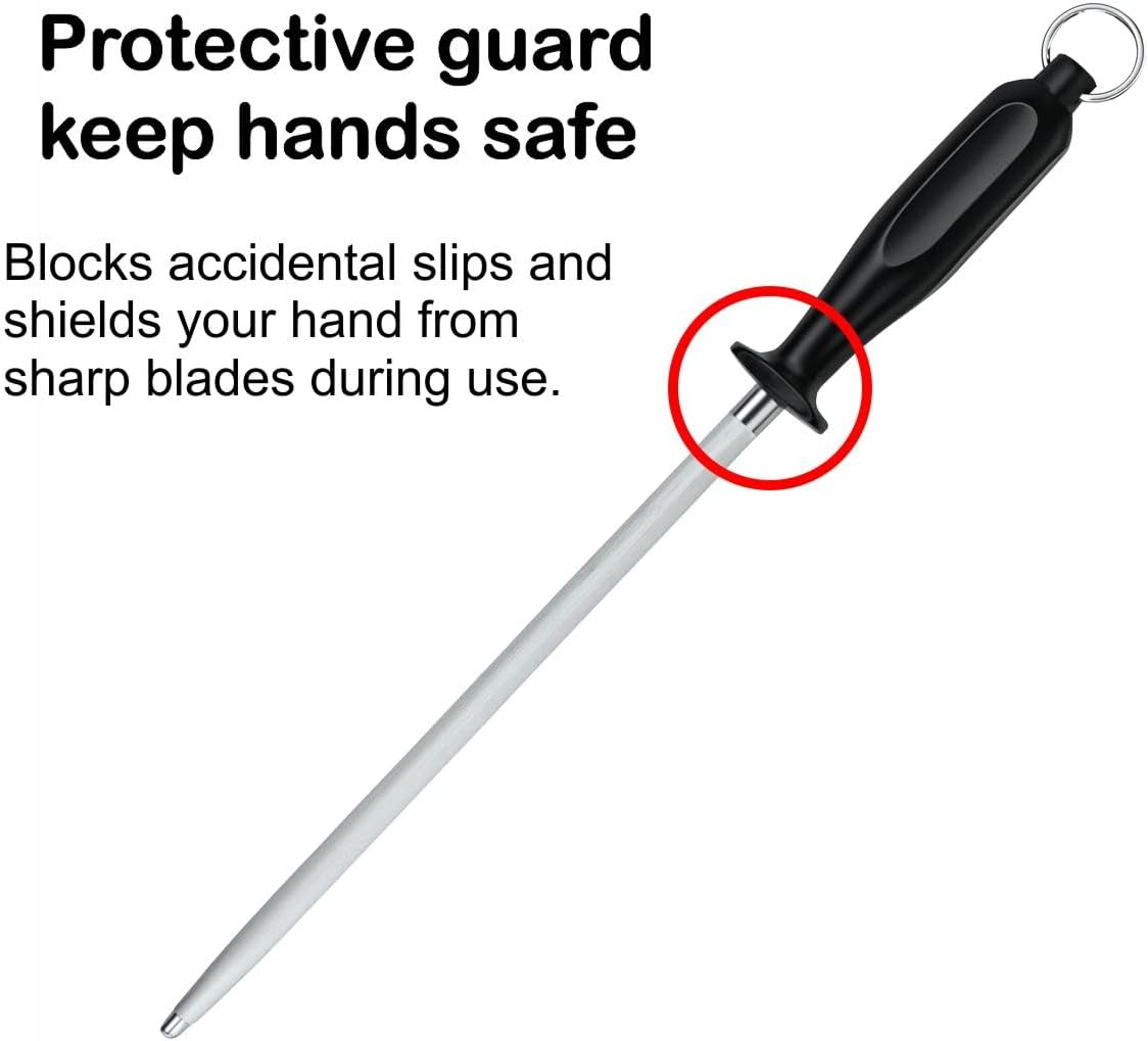 Made from premium high-carbon stainless steel, this 10 inch knife sharpener offers exceptional hardness and corrosion resistance. It’s specifically designed to realign the knife’s edge rather than grind it down, helping you maintain the original blade sharpness while extending its lifespan. The 10-inch rod provides the perfect length for sharpening a variety of knives — from large chef’s knives to small paring blades.