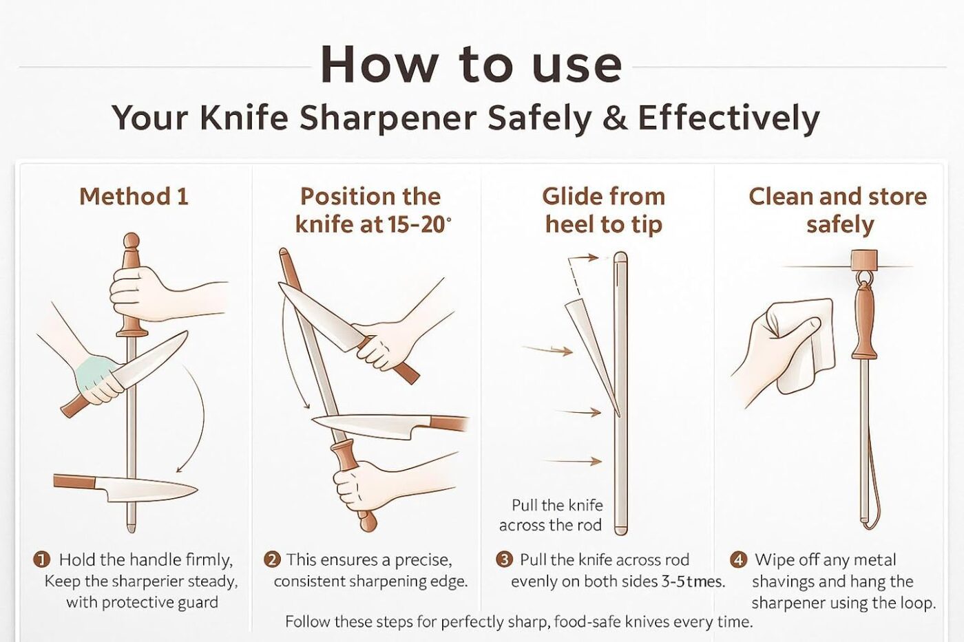 The ergonomic non-slip handle offers maximum comfort and control during sharpening, while the built-in finger guard ensures complete hand safety. Its balanced design reduces wrist fatigue, making it suitable for both professional kitchens and home cooking environments.